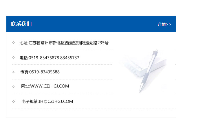 傳真:0519-83435688    郵編:213135    網址:WWW.czjhgj_com.pk853.com    電子郵箱:JH@czjhgj_com.pk853.com